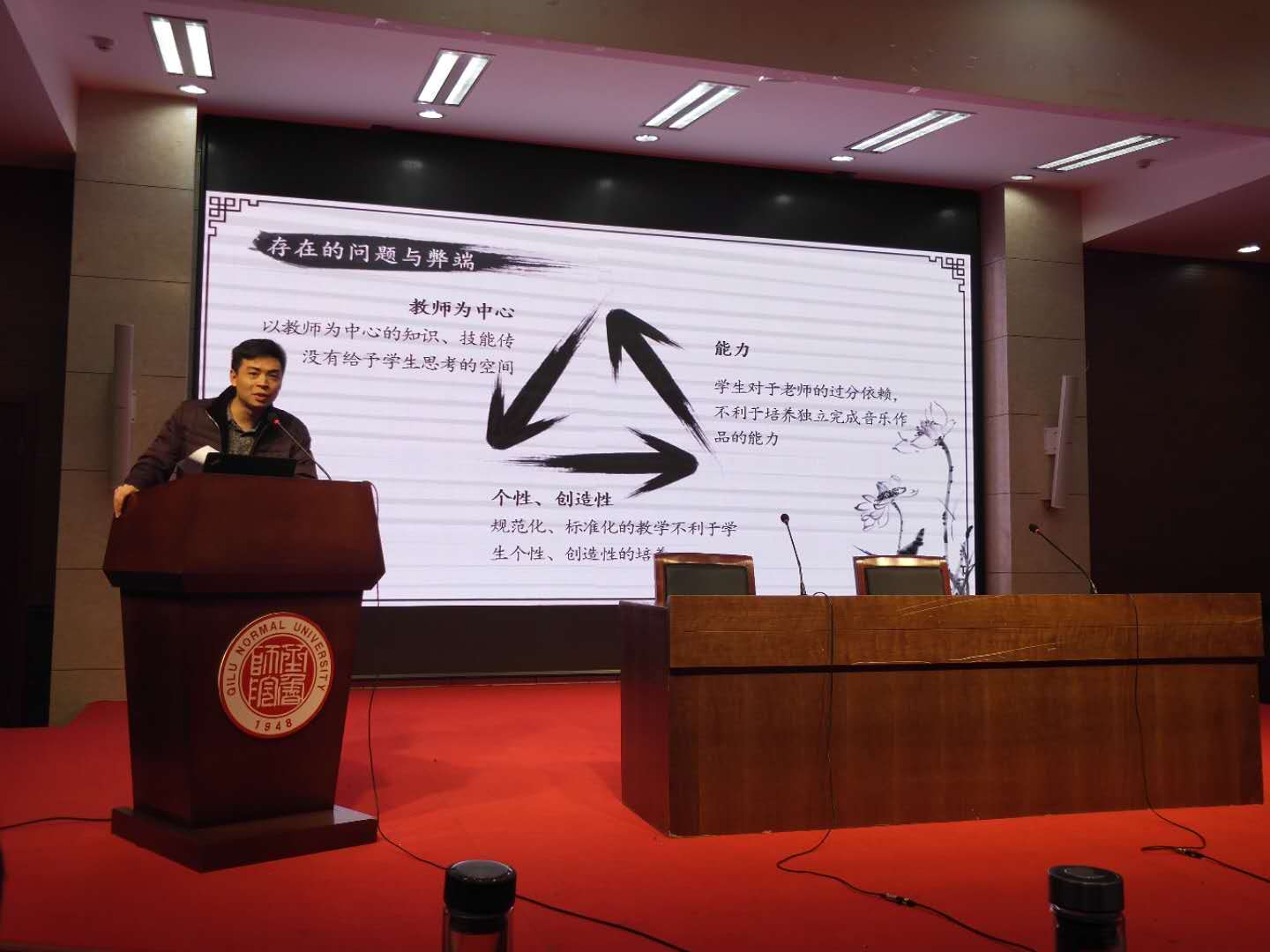 我院崔玉涛老师汇报的主题是“PBL模式对器乐技能课的思考”。主要通过PBL的教学模式,和PBL以学生为中心、以问题为导向、以培养能力为目的理念对器乐技能课做了一些思考。介绍了传统的器乐教学模式,反思了传统教学模式在教学中存在的个别问题。通过PBL模式的启示提出了在教学中要注重学生的主体性和学生能力的培养,并列举 “怎样掌握西北地域风格的音乐作品”为问题导向案例进行分析。通过教学案例的分析得出借助PBL模式的器乐教学相比传统的教学模式,可以更有效的建立学生良好的学习模式、加深知识的记忆、提高能力和音乐知识迁移等优势。