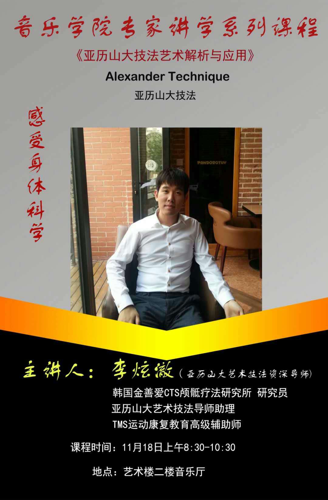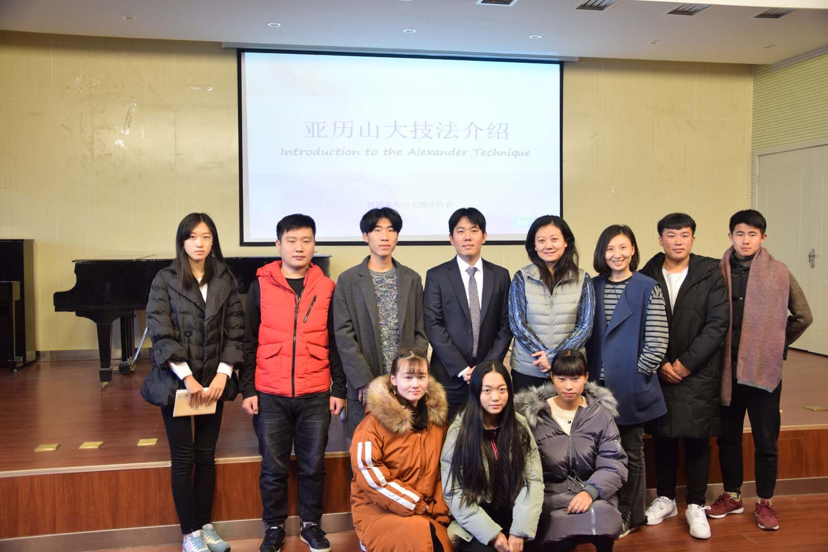 2017年11月18日,亚历山大艺术技法资深辅导师李炫澈老师在音乐学院音乐厅内为音乐学院学生 、学前教育学院学生们进行亚历山大技法讲解。 李炫澈老师讲解了技法的来源— 源于澳大利亚的亚历山大先生所研究的身体科学管理方法,艺术者需了解自我的身体来应用于艺术领域技能提升是此技法精华所在。亚历山大技巧需要循序渐进的练习,使它融入到自己的生活当中,从而指导自己身体机能良好运作。 亚历山大技巧帮助艺术人认识到艺术与身体的关系,艺术表达中的艺术教育往往缺失了对人体整体的认知,李铉澈老师的亚历山大技法对我们学习有很大的帮助,使我们受益匪浅,期待李炫澈老师再次来到我们学校交流指导。