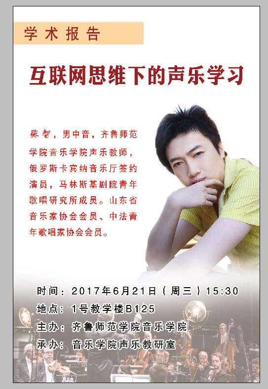 在基础教育课堂教学改革如火如荼的当下,在积极探索改革高校课堂模式的背景下,6月21日15:30由齐鲁师范学院音乐学院主办,我院青年教师张智在一号教学楼B125做了一场《互联网思维下的声乐学习》的学术报告。张智老师通过近年来对互联网领域与声乐学科的关联研究,用互联网思维、技术和模式与传统的声乐教学相结合,从中外声乐教育对比入手,找出差距,做出深度思考,探索利用互联网资源对声乐学科知识短板进行有效补充,让互联网与教学融合成为一种教学创新,现代信息技术使学习个性化成为可能。讲座通过对录音录像设备的运用和网络交流;利用网络资源分析声乐作品;利用网络资料解决谱面问题;声乐音频、视频的网络获取和有效利用;声乐相关学科的网络学习补充;作品的舞台呈现等几个方面进行深度解读和实践分析,思想深刻、内涵丰富,深入浅出,令人耳目一新。