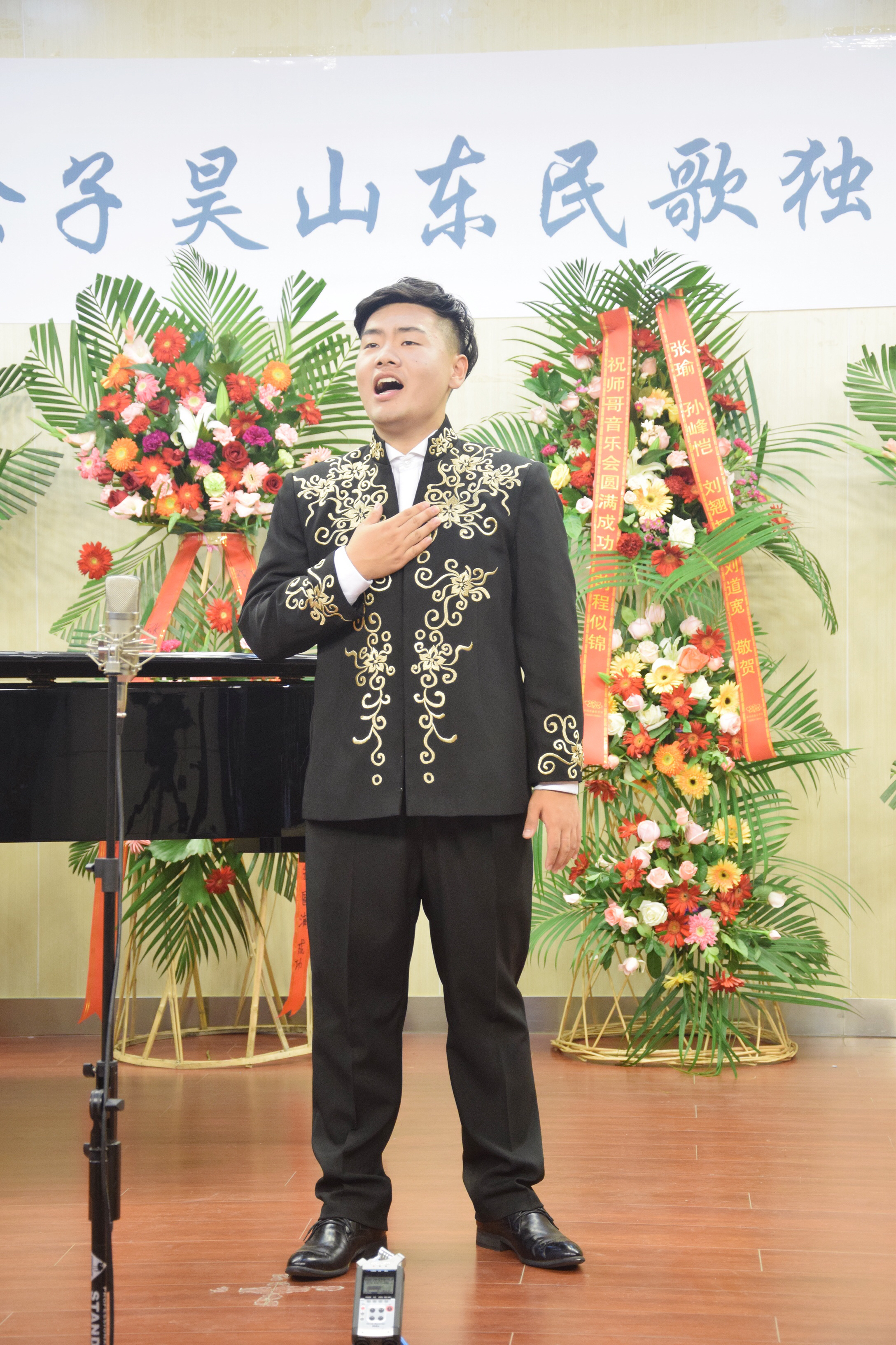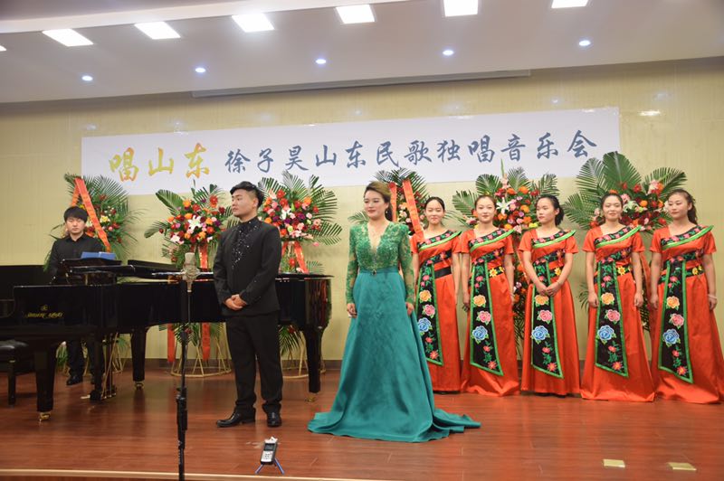 山东民歌是一种古老的汉族民间音乐,具有质朴、淳厚、强悍、粗犷、诙谐和风趣等特点,表现山东省汉族劳动人民朴实、憨厚的性情。徐子昊利用假期时间,多次到山东各地进行采风,利用课余时间编排民歌小齐唱,使得音乐会形式丰富多彩。本次音乐会徐子昊给大家演唱了来自山东各地市代表性曲目.以及独具山东特色的创作歌曲.以独唱、对唱、女生齐唱等表演形式让大家感受到了山东民歌的魅力。如《沂蒙山小调》.《放牛小调》、《大实话》、《闲来无事到庄西》、《绣花灯》、《泰山景》、《抗日小唱》等。经徐子昊的二度创作并演绎,融入了他对山东民歌的执着的热爱和追求:其中小齐唱给大家带来的《打秋千》、《赶牛山》、《大辫子甩三甩》等歌曲内容生动形象,旋律轻快悠扬,以新鲜的音调、疏密结合的节奏,使人耳目一新。与特邀嘉宾孙冰的对唱如《对花》、《五只小船》、《唱秧歌》唱出了婉转细腻的特点,也更加能反映当地的民俗风情。还有独具山东特色的创作歌曲《有一条这样的河》、《我唱家长美景多》、《山东,我亲爱的家乡》三首男声代表作唱出了浓浓的乡情乡韵,使听众沉浸在美好的回忆中。浓浓的乡情、亲情、师生情,感人至深。最后一曲《谁不说俺家乡好》结束整场音乐会。