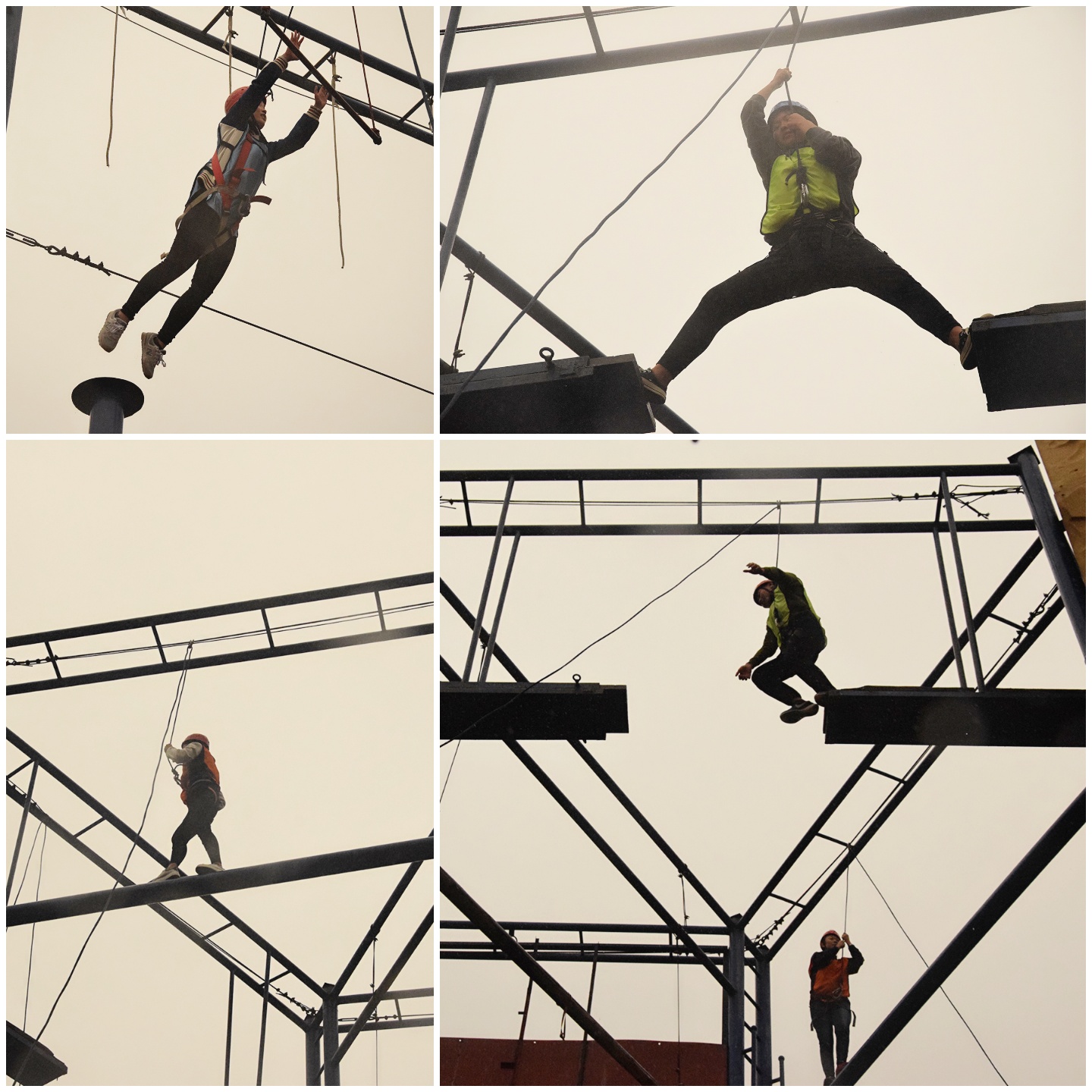 其中穿越电网环节最为艰难和精彩,成员们被分为A,B两队,需要队员从用软绳搭建的2个格子的立体“电网”中依次穿过去,而且任何一人一旦“触电”,需要全队队员重新穿越。各队员都付出了自己的努力与智慧,最终两队愿以其中一队任何成员触碰“电网”即全员都要回去重新开始的危险合并为一队,互帮互助,最终取得成功。