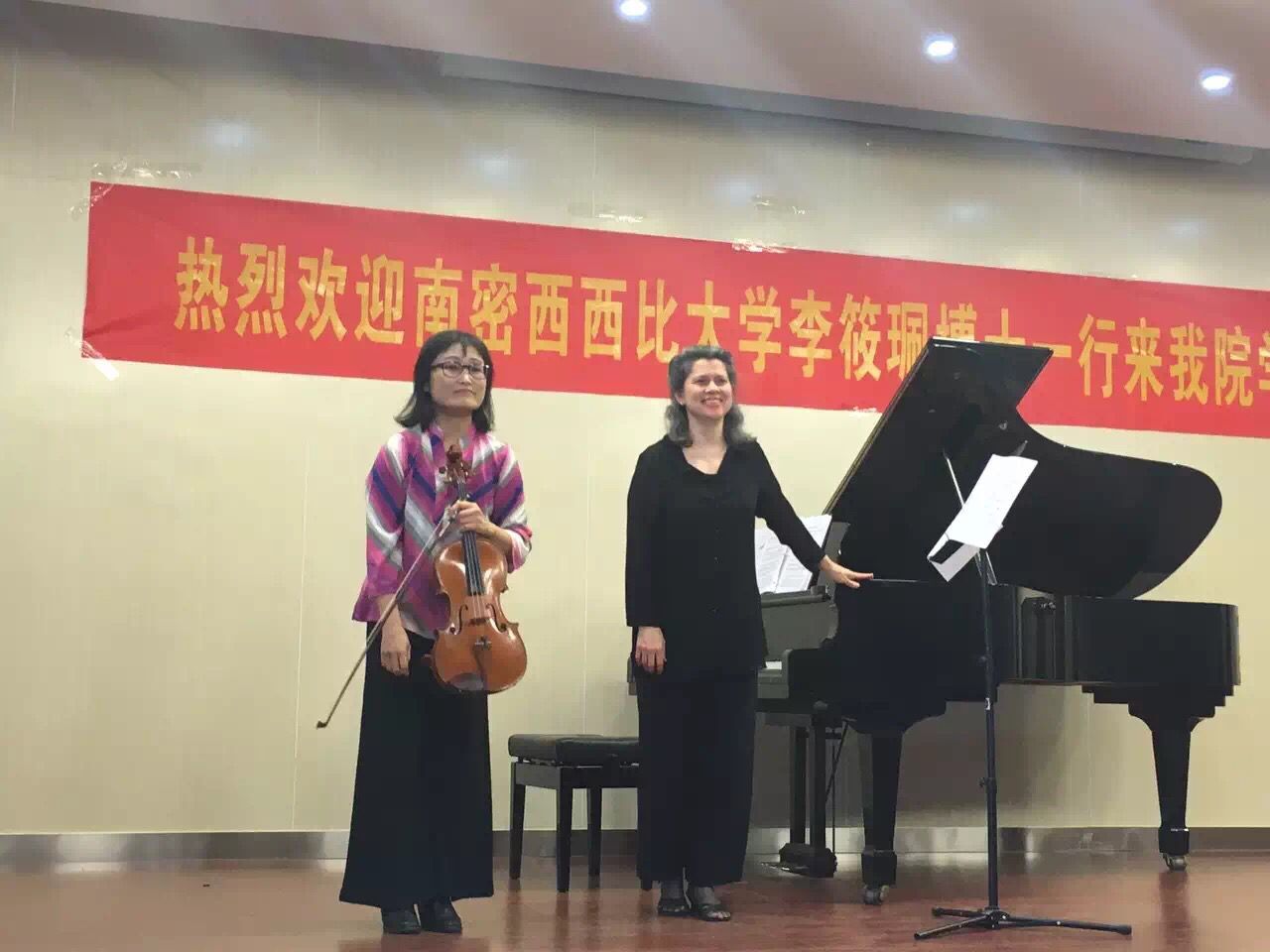 17日下午13:50,李筱珮博士、Elizabeth Moak博士中提琴、钢琴音乐会在音乐学院音乐厅拉开序幕,两位专家精湛的演奏和讲解赢得现场师生的热烈掌声。与此同时Stacy Reischman Fletcher院长的舞蹈大师班也在进行中,为我们的舞蹈学专业的学生做了悉心的讲解与指导。音乐会结束后,音乐学院院院长窦曼莉、党总支书记万梅红、副院长常爱玲为三位专家颁发了客座教授的聘书。随后,李筱珮博士、Elizabeth Moak博士还分别在1139会议室、音乐厅举行小提琴、钢琴大师班,吸引了众多的师生前来观摩学习。