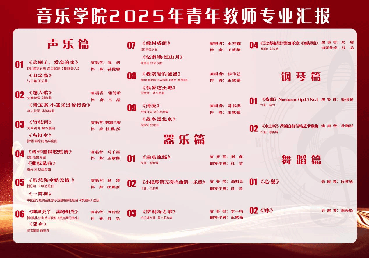 本次专业汇报会不仅是青年教师阶段性艺术成果的集中检阅,也是一次生动的教学相长实践。它体现了音乐学院对青年教师专业成长的高度重视,展现了学院教师队伍蓬勃向上的艺术活力与扎实的专业素养。学院将持续为青年教师搭建展示、交流与提升的平台,鼓励他们在深耕教学的同时不断追求艺术精进,为学院的教育教学与艺术实践发展注入持续的动力。