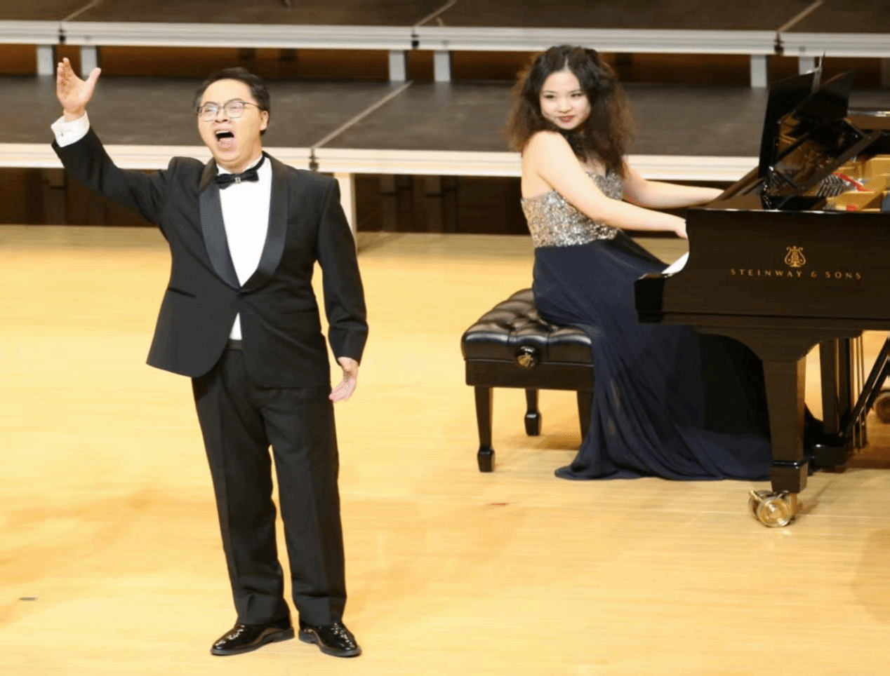 我院副院长徐定兴在音乐会下半场精彩亮相,与其他九位男高音歌唱家联袂献唱了世界经典名曲《啊,我的太阳》与《今夜无人入睡》。徐定兴以饱满的热情、精湛的技艺和富有感染力的舞台表现,完美演绎了作品的艺术内涵,其恢弘而深情的歌声赢得了现场观众热烈的掌声,充分展现了我院师资队伍高超的专业水准与艺术风采。音乐会的最后,全体演员与观众齐声高唱《我和我的祖国》,将现场气氛推向最高潮。