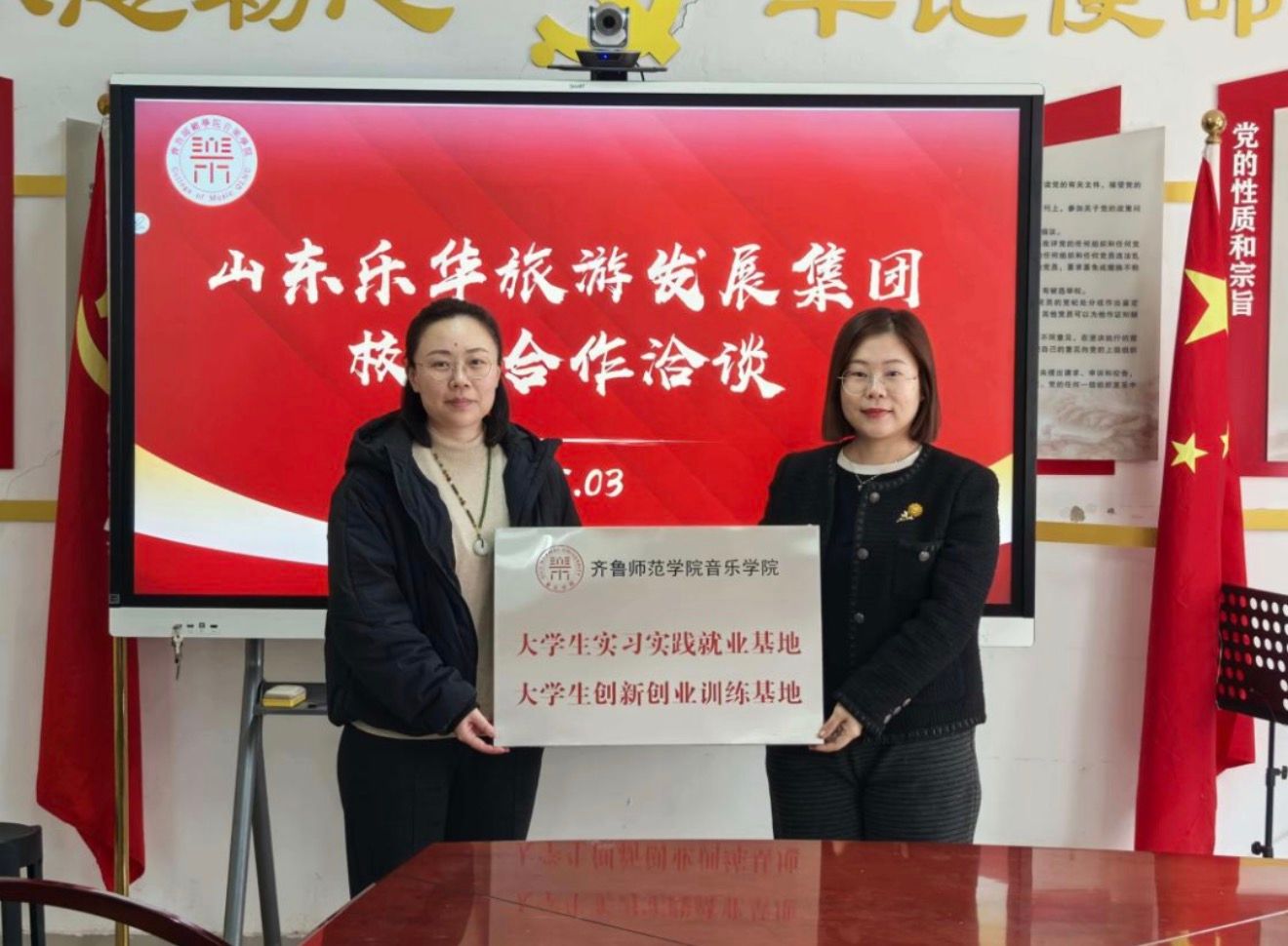 为扎实做好“访企拓岗促就业”专项行动,精准对接行业人才需求,拓宽毕业生就业创业渠道。3月13日,音乐学院与山东乐华旅游发展集团有限公司开展校企合作洽谈并举行“大学生实习实践就业基地 大学生创新创业训练基地”揭牌仪式,开启校企协同育人、共促就业新篇章。会议由学院党委副书记姜晨主持。