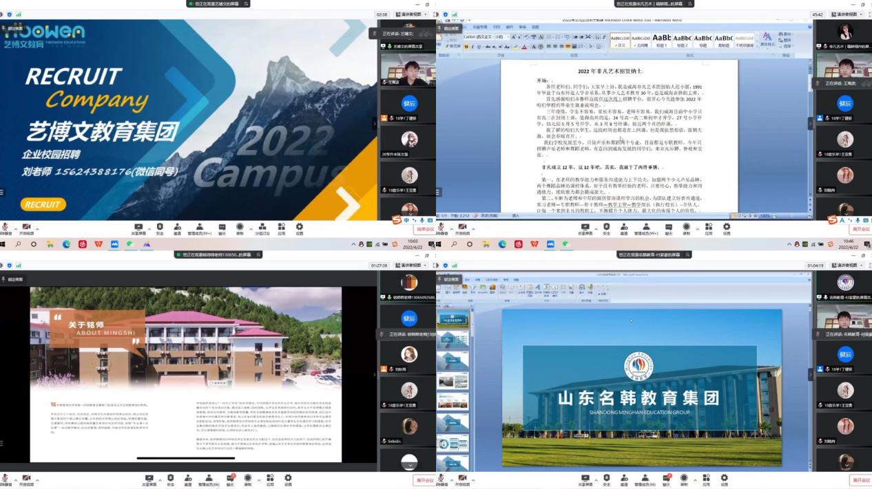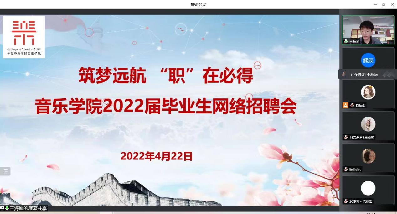会议伊始,音乐学院毕业班辅导员王海波向用人单位简要介绍了学院的办学特色、办学定位、人才培养模式及学院2022届毕业生整体情况。本次专场招聘会共有济南市历下区铭师教育培训学校、济南市市中区艺博文教育培训学校、山东名韩教育信息集团有限公司、威海非凡少儿艺术培训中心4家企业抛出“橄榄枝”,在招职位50余个,为广大音乐学、舞蹈学专业毕业生就业打造了一个良好、坚实的就业平台,提供了大量优质就业岗位。与此同时,考虑到疫情防控现状,本次招聘会采取网络招聘形式开展,同学们只需线上投送简历,极大程度的减少了同学们寻找岗位中的困难。