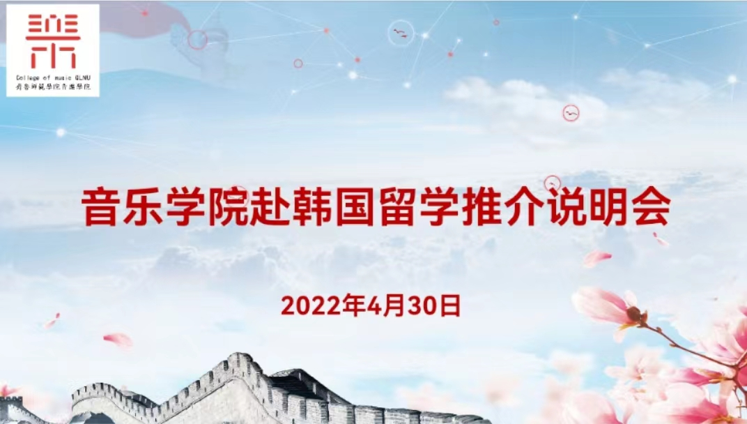 4月30日下午,音乐学院与我校国际合作与交流处联合举办韩国留学项目推介会。国际交流与合作处处长何艳、副处长谢士金及田甜老师参加推介会,音乐学院近300名同学线上参与此次活动,会议由音乐学院党委副书记迟英娟主持。根据疫情防控要求,本次推介说明会以线上的形式开展。