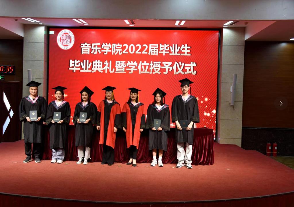 合影活动结束后,齐鲁师范学院音乐学院在图书馆学术报告厅举行2022届毕业生学位授予仪式,全体毕业生共同见证人生的重要时刻。报告厅开场视频展现了青年学子一幕幕奋斗的剪影,校园的场景串联起青葱岁月的点滴。毕业典礼在庄严氛围中正式开始,音乐学院院长万梅红、副院长桑潇为在场的毕业生们授予学位、扶苏拨穗,并送上美好祝愿,共同见证人生高光时刻。部分毕业生的父母、长辈们也纷纷到场为全体毕业生送上最真挚的祝福和期许。