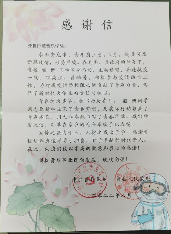 近日,我校音乐学院接连收到两封感谢信,一封是来自山东省菏泽市曹县人民政府的感谢信,感谢2021级音乐学三班赵博同学在暑假期间积极参与当地疫情防控志愿服务,为打赢疫情防控阻击战贡献了青春力量。另一封是来自共青团聊城市茌平区委的感谢信,感谢2021级音乐学三班贾艳慧同学在暑期积极参加“返家乡”社会实践,与当地干部共同奋斗在脱贫攻坚战第一线,得到了实践单位的肯定和表扬。