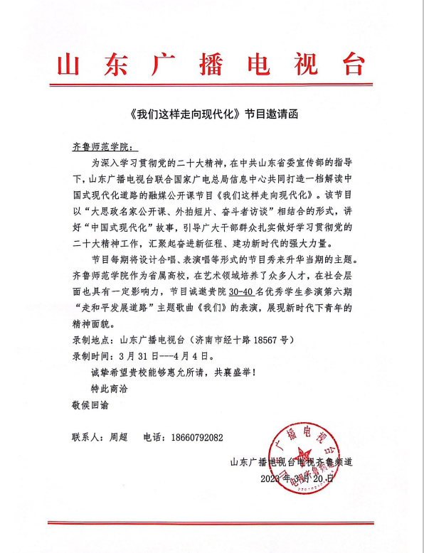 为深入学习贯彻党的二十大精神,在中共山东省委宣传部的指导下,山东广播电视台联合国家广电总局信息中心共同打造融媒公开课节目《我们这样走向现代化》。3月31日,我校众乐合唱团应邀参加节目录制,参演第六期“走和平发展道路”主题歌曲《我们》。