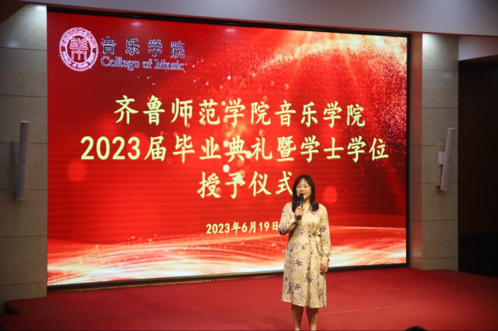 6月19日,音乐学院在图书馆学术报告厅举行学士学位授予仪式,音乐学院院长万梅红、党委书记王允华、副院长桑潇、党委副书记姜晨、毕业班辅导员及2023届毕业生参加仪式。