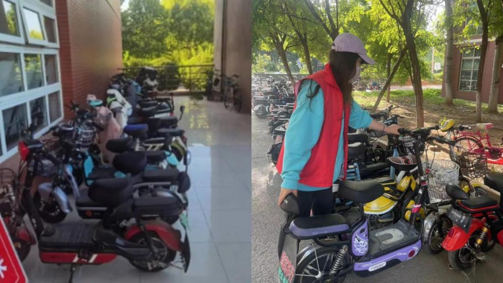 学生会成员们对乱停乱放的车辆进行了统一管理,每次发现有乱停乱放行为时及时进行劝导并伸出援手将其摆放整齐,为同学们普及共享单车及电动车的合理摆放位置。