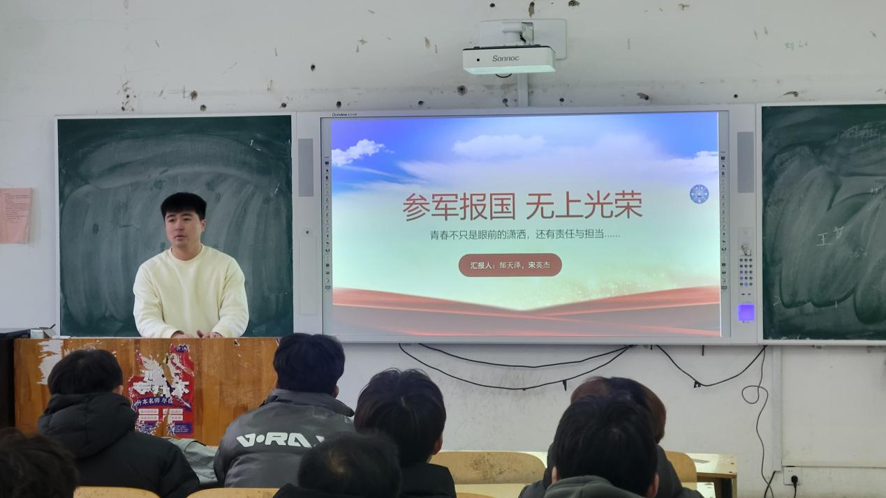 为响应征兵号召,深化国防教育,培养学生爱国情怀和责任意识。12月21日,音乐学院举办大学生国防教育暨2024年度征兵动员会。会议由学院国防教育宣讲团成员、退役复学学生宋英杰主讲。