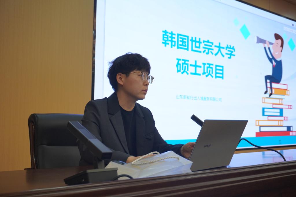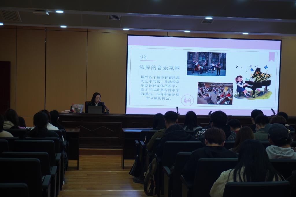 会前,何艳向招生单位详细介绍了2024届毕业生的专业方向以及同学们的留学意向,并对各个年级不同阶段的学生做了积极动员,鼓励学生要走出去,开阔视野,勇于尝试,拓宽自己的就业渠道,把出国深造作为每个毕业生的重点工作,明确自己的未来发展方向。会上,济南至尚教育集团资深留学顾问侯知吟从校情校史、文化特色、师资力量、机构设置和办学水平等方面,多方位多角度地为学生们进行了俄罗斯、意大利、丹麦、爱尔兰等多所音乐院校进行讲解和介绍。济南新知行出入境有限公司赵胜男从招生对象、专业类别、录取名额以及学位、学制、就读成本、发展前景等方面展示韩国世宗大学的优越学习条件,并就申请要求及流程等相关问题做了进一步的解释,随后对新加坡、泰国音乐方向硕士择校做了详细的介绍。