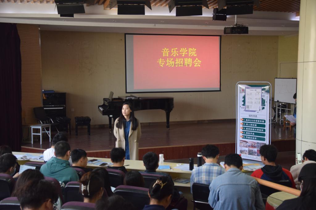 为了进一步拓宽毕业生就业渠道,高质量推进毕业生就业工作,狠抓就业政策落实,推动毕业生更充分就业和更高质量就业。2021年5月18日下午两点,音乐学院在音乐厅进行了2021届毕业生专场招聘会,本次招聘会前来宣讲的是艺馨鹏程培训学校的负责人李老师,我院部分2021届毕业生积极参加。