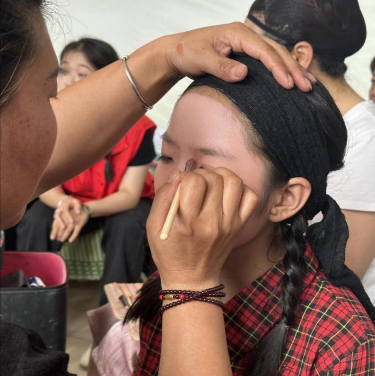 随后,马乃转邀请服务队师生前往五音戏的传习所,近距离观察演员们上台前妆造准备的过程。青野剧团的演员们一边熟练地用笔刷涂抹上妆,一边耐心回应了队员们的问题,讲解了不同角色妆造的特点。五音戏的化妆艺术是其表演艺术的重要组成部分,通过精心的化妆设计,能够增强角色的艺术形象以及演员在舞台上的情感传达,使观众能够更加深入地理解和感受角色的内心世界。