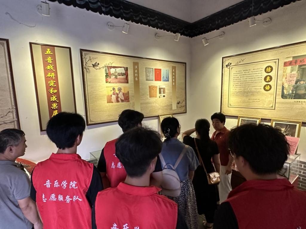青野五音戏剧团团长、五音戏第六代传承人马乃转热情接待了服务队师生,带领大家参观五音戏博物馆,介绍了五音戏的起源和发展过程、代表人物、经典唱腔、表演特色,并根据自己的实际经历,详述了青野五音剧团的创建、传承和发展历史。